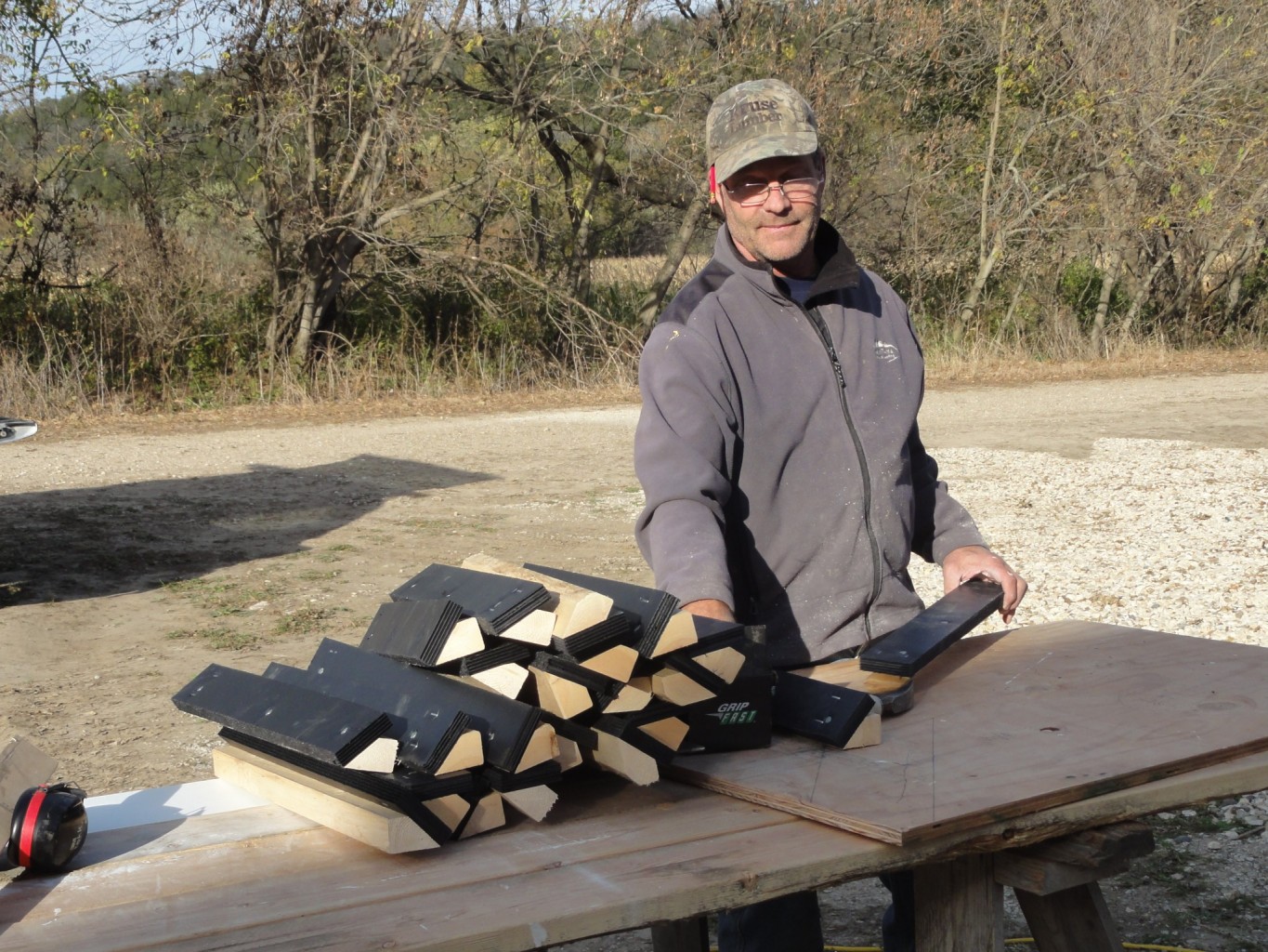 Eric Gehrke’s been on site painting breezeway trusses, breezeway roof sheeting and eaves of the house. Warm days come and go now, and rain forced him inside to do pre-assembly finishing for the breezeway.